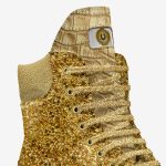 Elevate your style with these luxurious gold crocodile boots featuring glitter laces and a unique design. Perfect for fashion enthusiasts and those who dare to be different.