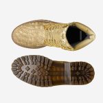 Add a touch of luxury to your outfit with these one-of-a-kind gold crocodile boots. Featuring glitter laces and a unique design, these boots are perfect for anyone looking to make a fashion statement. The gold crocodile material is sure to turn heads, while the glitter laces add a touch of glamour.