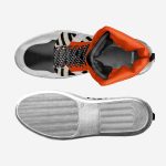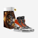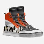 Introducing the Ultramega Bengali Tiger Sneakers, a bold and adventurous footwear experience. These high-top sneakers feature a striking design inspired by the majestic Bengal tiger, with a predominantly white base, black accents, and vibrant orange details. The shoe’s upper material is adorned with a unique tiger stripe pattern, adding a touch of wild elegance.